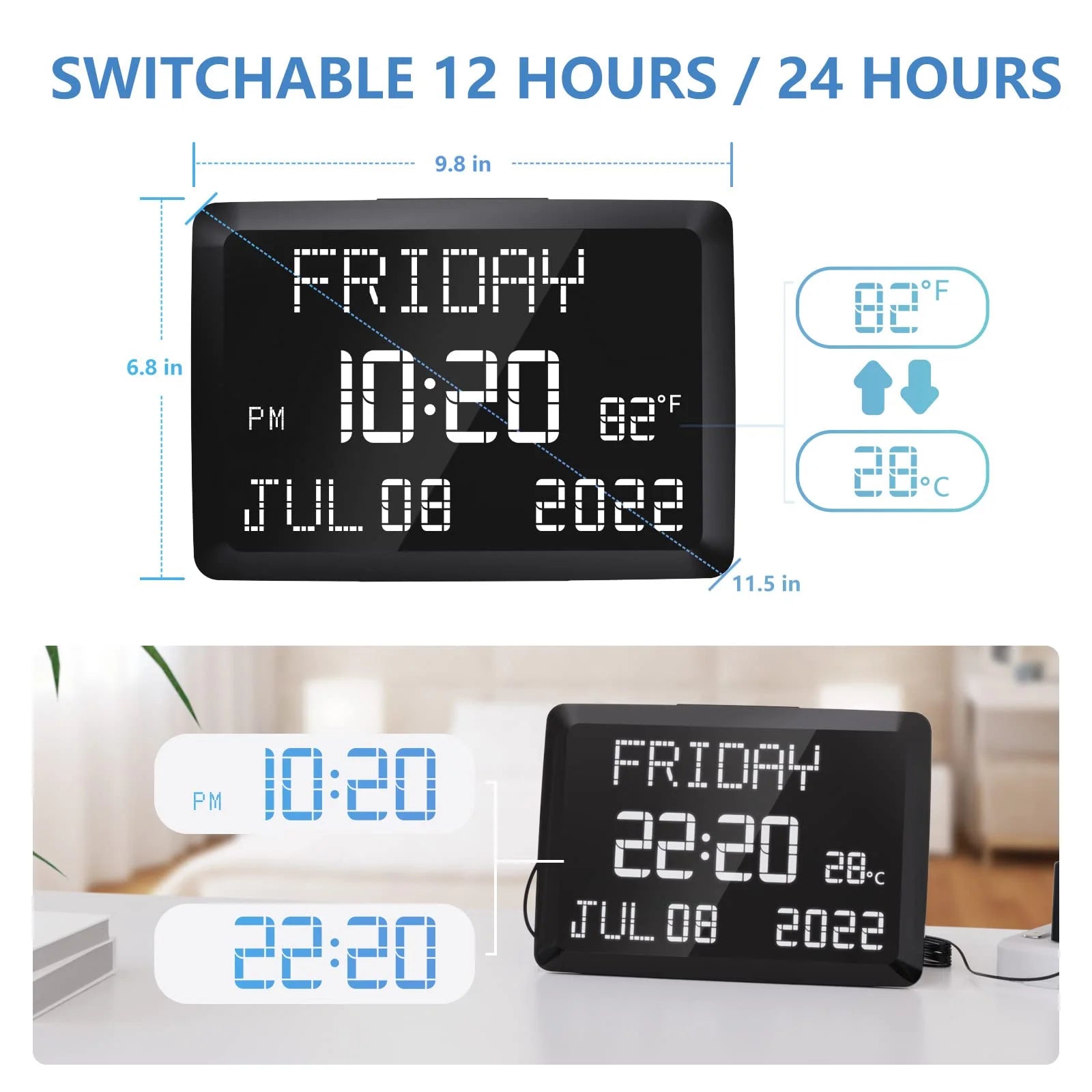 YARBAR Digital Clock, 11.5" Large Display Digital Wall Clock,Adjustable Brightness Calendar Clock with Day and Date, Indoor Temperature, Snooze,12/24H, DST for Home, Office, Elderly